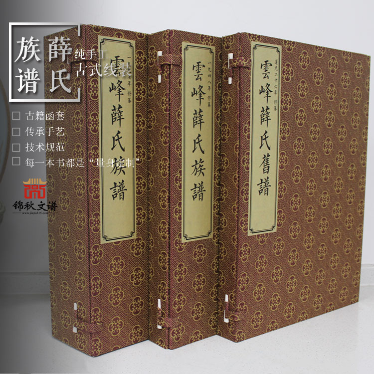日前,由錦秋文譜中華家譜館負(fù)責(zé)承印的《云峰薛氏族譜》已成功交付。該譜全部為老譜修復(fù)影印版,版本分別為:一九四八年修纂的《云峰薛氏族譜》上下兩卷,單本道光二十六年修纂的《云峰薛氏族譜》,一九九七年修纂的五卷《云峰薛氏族譜》。三個不同版本全部采用古式線裝右裝訂的方式。韓錦布料的選用利于族譜長久保存。在開本上,沿用了老譜的1:1還原尺寸,美觀典雅大方。