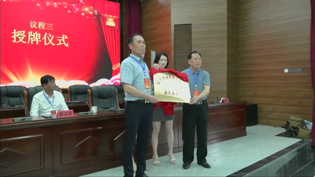 議程三:舉行福清市姓氏源流研究會薛氏委員會授牌儀式;請福清市姓氏源流研究會會長陳煥旺先生為福清市姓氏源流研究會薛氏委員會授牌,請薛書文會長接牌;