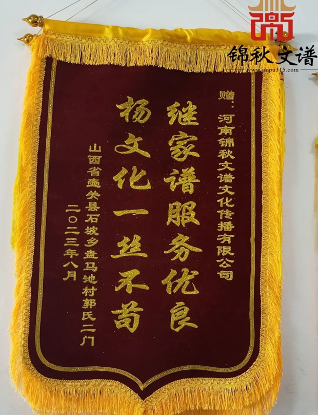 近日,郭氏宗親聽說家譜已經編印完成,特地從山西趕來鄭州,懷著激動的心情來到錦秋文譜中華家譜館請譜,并敬送了錦旗(繼家譜服務優(yōu)良 揚文化一絲不茍)